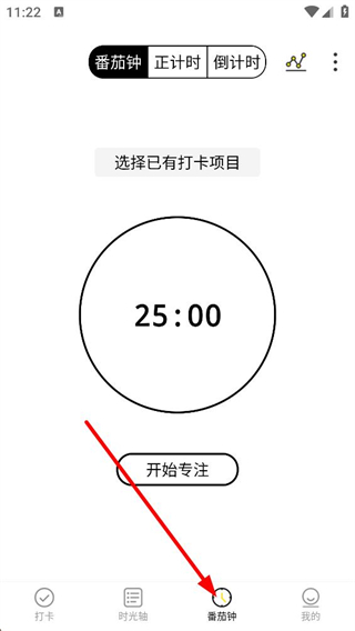 4、進入番茄鐘頁面,可選擇已有打卡項目關聯專注計時,設置正計時或倒計時模式,點擊“開始專注”即可啟動對應的計時流程。