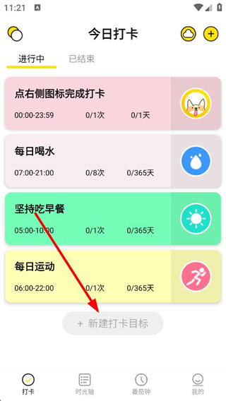 1、進入打卡頁面可查看當前進行中的打卡項目,包含日常行為類目標,點擊底部新建打卡目標按鈕,即可進入打卡目標創建界面。