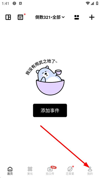 1、進入倒數321主界面,頂部顯示倒數321全部的分類,中間有添加事件按鈕,底部有首頁美化拍立傳戀愛星我的等功能入口,點擊我的可進入個人界面。
