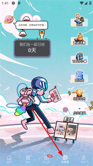 4、進入戀愛星界面,能看到我們在一起已經的天數顯示,還有點擊切換守護星的提示,右側有軌跡更換場景等功能入口,可通過這些功能記錄相關內容。