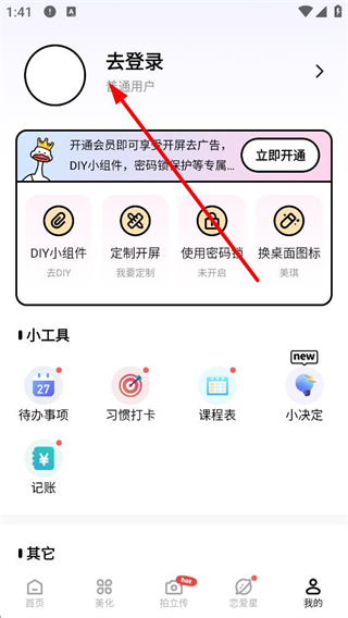2、我的界面能看到去登錄選項,還有開通會員享免開屏廣告等特權的提示,以及DIY小組件定制開屏等功能入口,下方還有待辦事項習慣打卡等小工具。