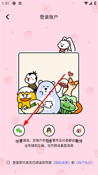 3、點擊去登錄后進入登錄賬戶界面,可選擇微信等方式登錄,登錄后賬戶的所有事件及分類會存儲到云端,也可跨設備登錄,需先勾選同意相關協議。
