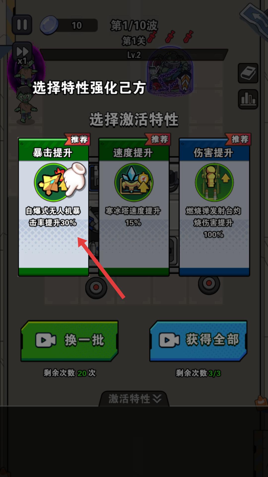 3、在選擇激活特性的界面,根據推薦,選擇暴擊提升,能讓自爆式無人機暴擊率提升,增強己方的攻擊效果。