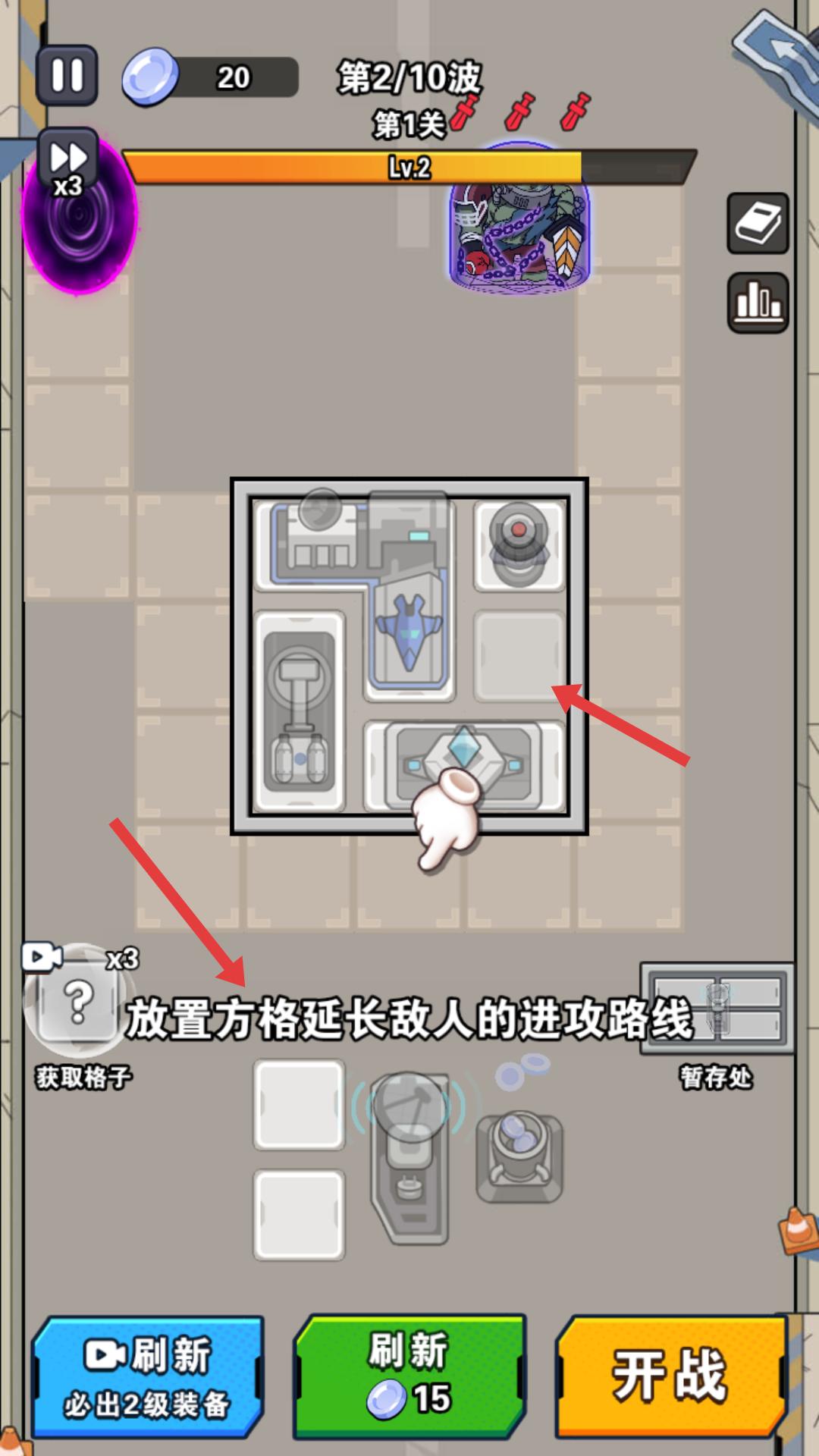 4、到了第二波怪物進攻前,放置方格來延長敵人的進攻路線,這樣能為己方爭取更多攻擊時間,更好地應對怪物。