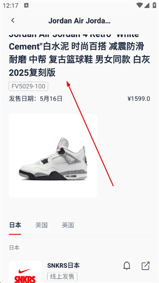 2、在發售日歷頁面選擇感興趣的球鞋,進入商品詳情頁,查看球鞋的發售日期、價格、款式等信息。