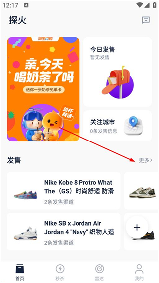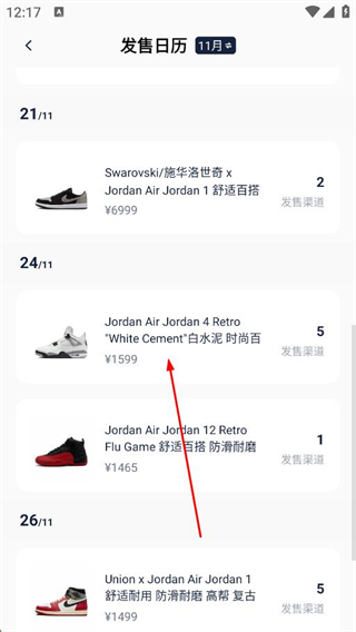 1、進入軟件后點擊發售板塊的更多按鈕,進入發售日歷頁面,可查看不同日期的球鞋發售信息,如21日的施華洛世奇聯名款、24日的Jordan白水泥款等。
