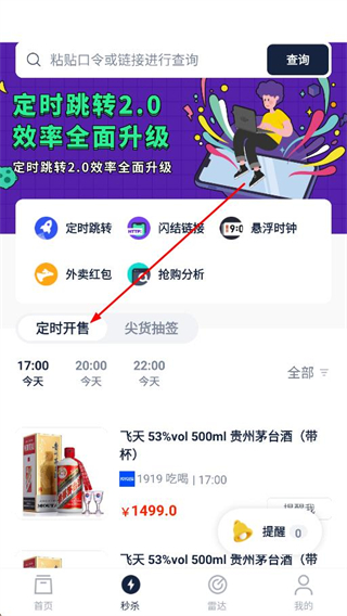 4、進入秒殺板塊可使用定時開售功能,查看不同時間的開售商品,如飛天茅臺等,還能利用定時跳轉、閃結鏈接等工具,提升搶購效率。