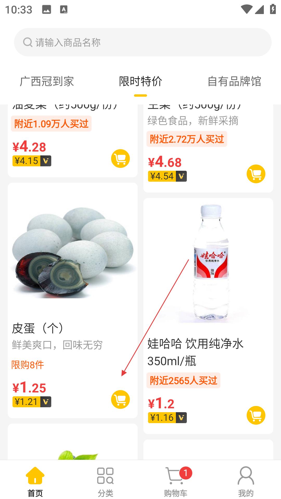 2、在限時特價區域,選擇自己需要的商品,比如皮蛋加入購物車進行購買。