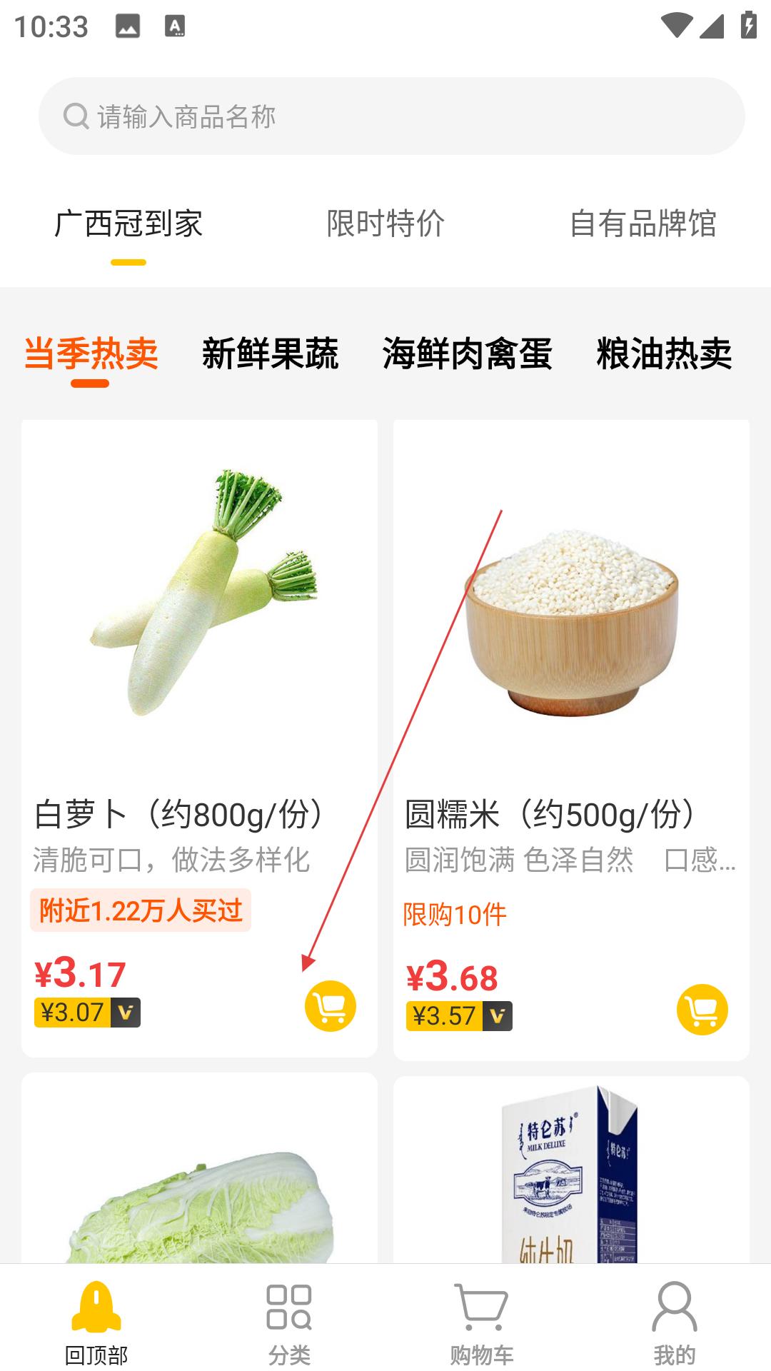 1、進入軟件首頁瀏覽當季熱賣、新鮮果蔬等分類,選擇白蘿卜、皮蛋等商品,點擊購物車圖標,將商品加入購物車。