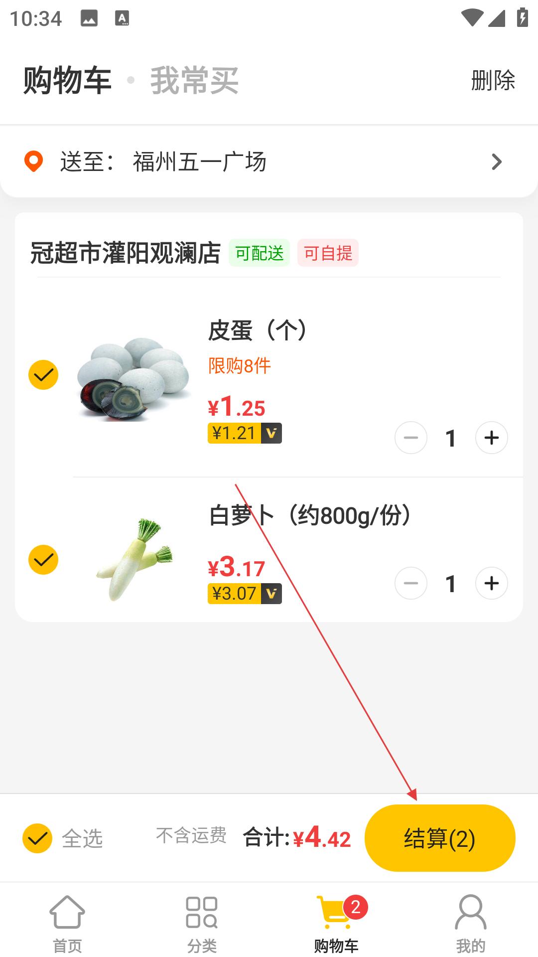 3、進入購物車頁面確認選購的皮蛋、白蘿卜等商品,點擊結算,進入訂單結算頁面。