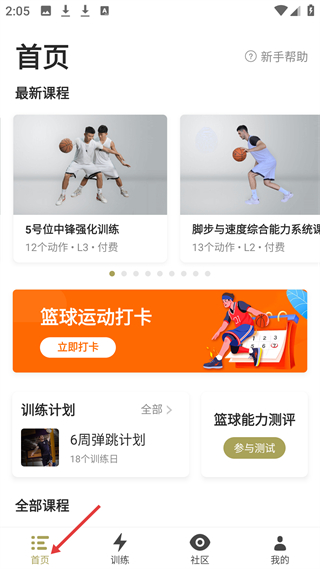 1、首頁展示最新籃球課程,推籃球打卡活動,設訓練計劃、能力測評入口,方便用戶發現籃球課程和活動。
