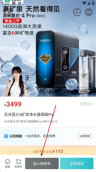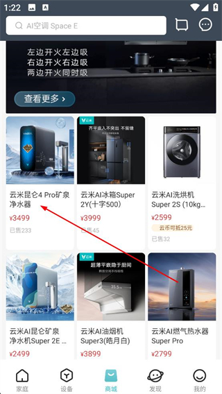 1、進入云米APP的商城頁面可查看云米昆侖4Pro礦泉凈水器等家電商品,選擇心儀的凈水器點擊進入詳情頁。