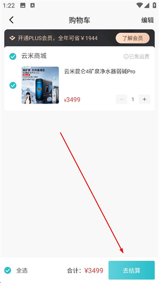 4、進入購物車頁面確認凈水器的規格、數量和價格無誤后,點擊去結算按鈕,還可了解開通PLUS會員的優惠。