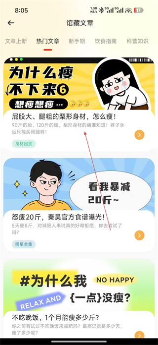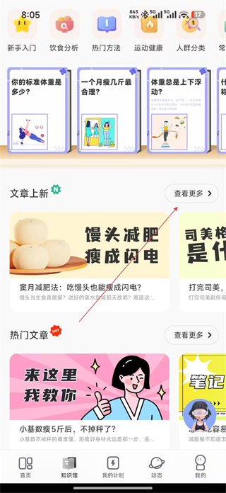 1、打開當燃軟件,進入首頁后,點擊文章上新板塊的查看更多按鈕,進入館藏頁面,瀏覽各類減肥相關文章。