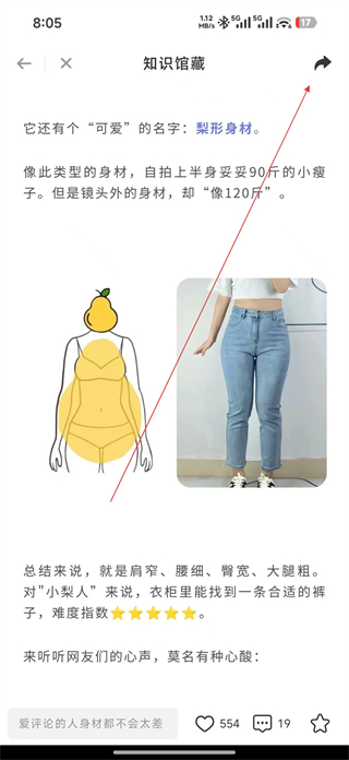 3、在知識館藏頁面閱讀完梨形身材的介紹內容后,點擊頁面上方的分享按鈕,彈出分享選項界面準備分享該內容。