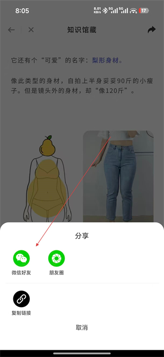 4、在分享選項界面中選擇微信好友等渠道,即可將該減肥知識內容分享出去,方便他人了解梨形身材的相關減肥知識。