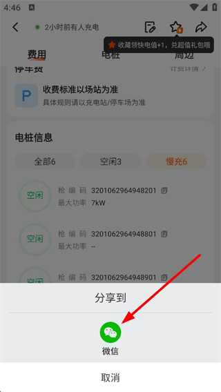 3、充電站詳情頁可查看電樁信息,包括空閑數量、槍編碼等,還能將該充電站分享至微信,收藏電站還可領取快電值。