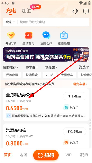1、快電首頁可切換城市,通過搜索欄查找充電站,同時能看到推薦電站的距離、電價等信息,部分場站綁定車牌可減免停車費。