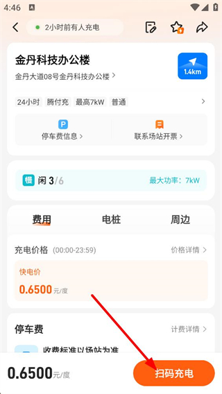 2、點擊具體充電站進入詳情頁,可查看其地址、運營時間、功率等信息,也能了解停車費規則,點擊掃碼充電即可啟動充電流程。