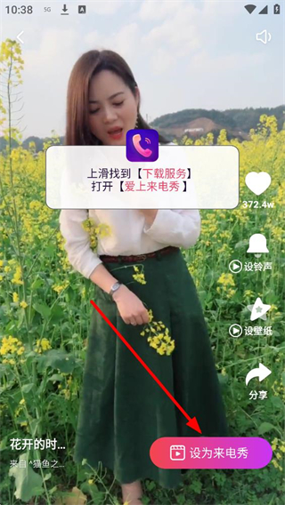 4、視頻播放頁面,可看到設置鈴聲、設壁紙、分享等功能,還有設為來電秀按鈕,按照提示上滑找到下載服務打開愛上來電秀,可將喜歡的內容設為來電秀。