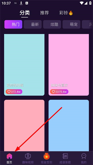 1、進入應用首頁,有分類、推薦、彩鈴板塊,分類下有熱門、最新等標簽,展示各類內容卡片,底部導航欄有首頁、趣味視頻等選項,方便用戶瀏覽不同板塊內容。