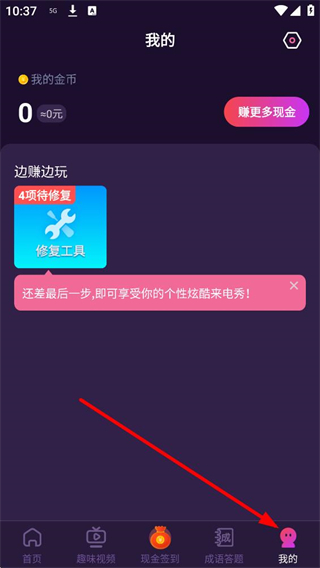 2、點擊我的進入個人頁面,可查看我的金幣數量,有賺更多現金入口,還有邊賺邊玩板塊的修復工具,提示還差最后一步可享受個性炫酷來電秀,可進行個人相關功能操作。