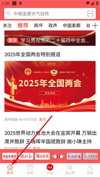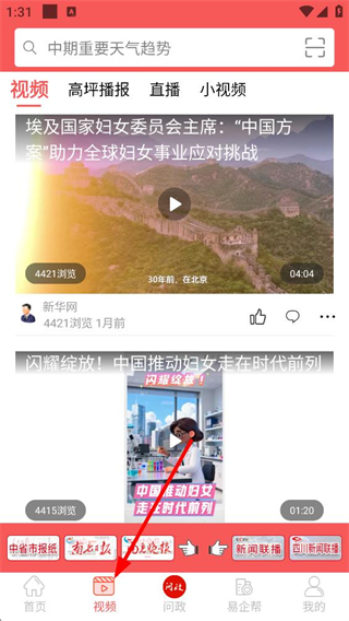 4、點擊底部視頻按鈕,進入視頻頁面,可見高坪播報、直播等視頻分類,還有各類視頻資訊展示,可觀看視頻內容。