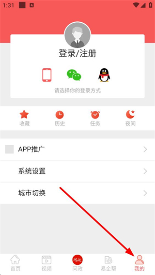 2、點擊底部我的按鈕,進入個人頁面,可看到收藏、歷史等功能入口,還有系統設置、城市切換等選項,未登錄時顯示登錄、注冊,可選擇手機號、微信、QQ等方式登錄。