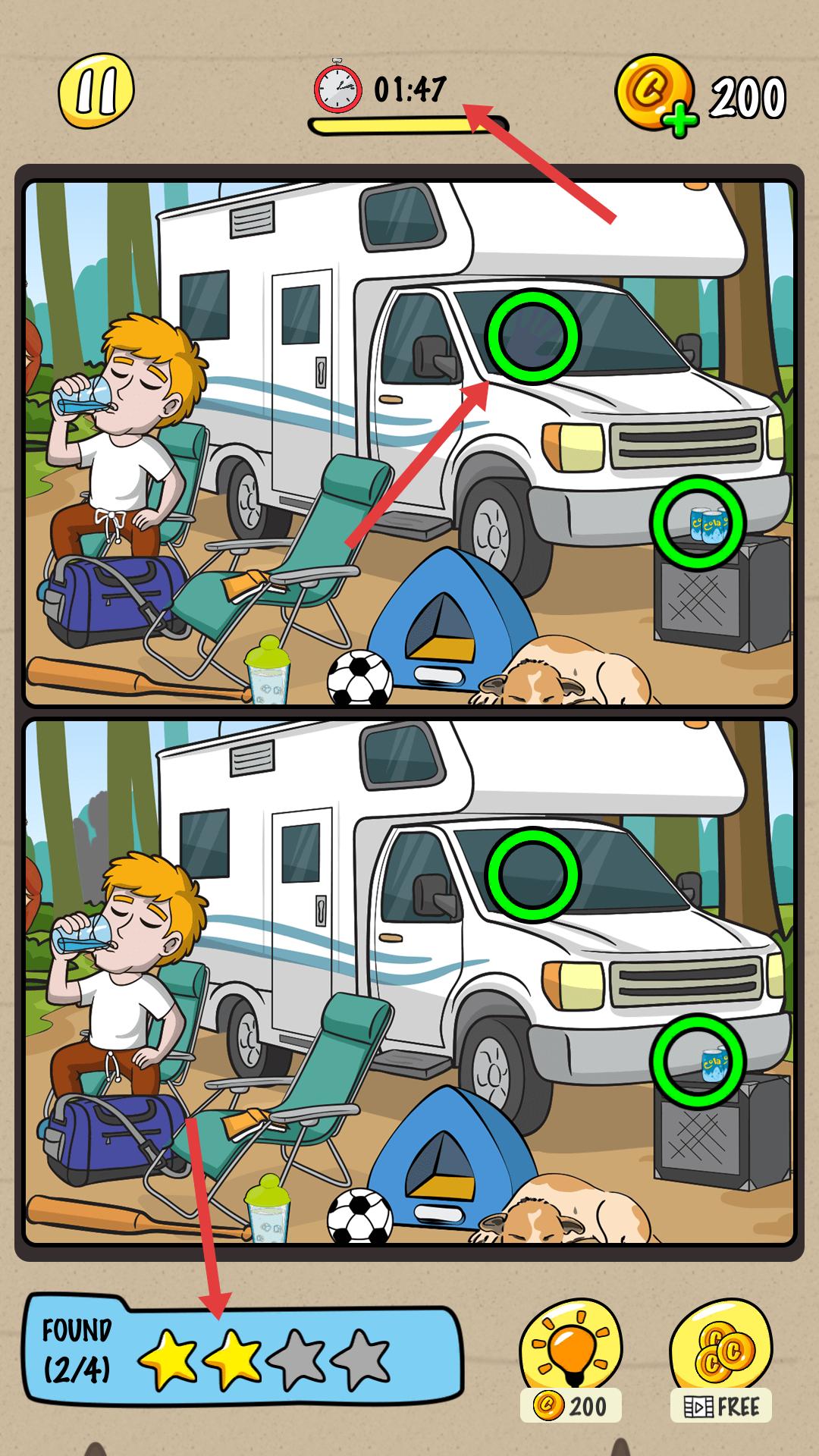 4、智能提示功能:內置三級提示輔助系統,可依次顯示差異區域輪廓、半透明標記和精確定位。每次使用消耗累積金幣,既保持挑戰初心又提供必要幫助。