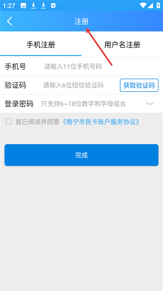2、注冊界面,有手機和用戶名注冊兩種方式,手機注冊輸手機號、驗證碼、設密碼,勾選協議后完成注冊。