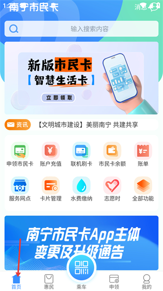 4、首頁界面,有新版市民卡領取入口,有資訊板塊,提供多種市民卡業務功能入口,方便用戶辦理申領、充值等相關業務。