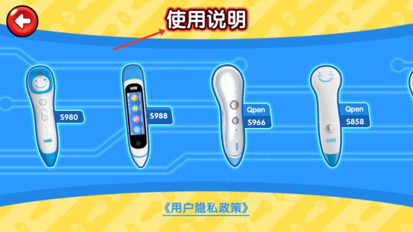 2、點擊使用說明界面,藍色背景呈現S980等多款易讀寶設備,下方有用戶隱私政策相關內容。