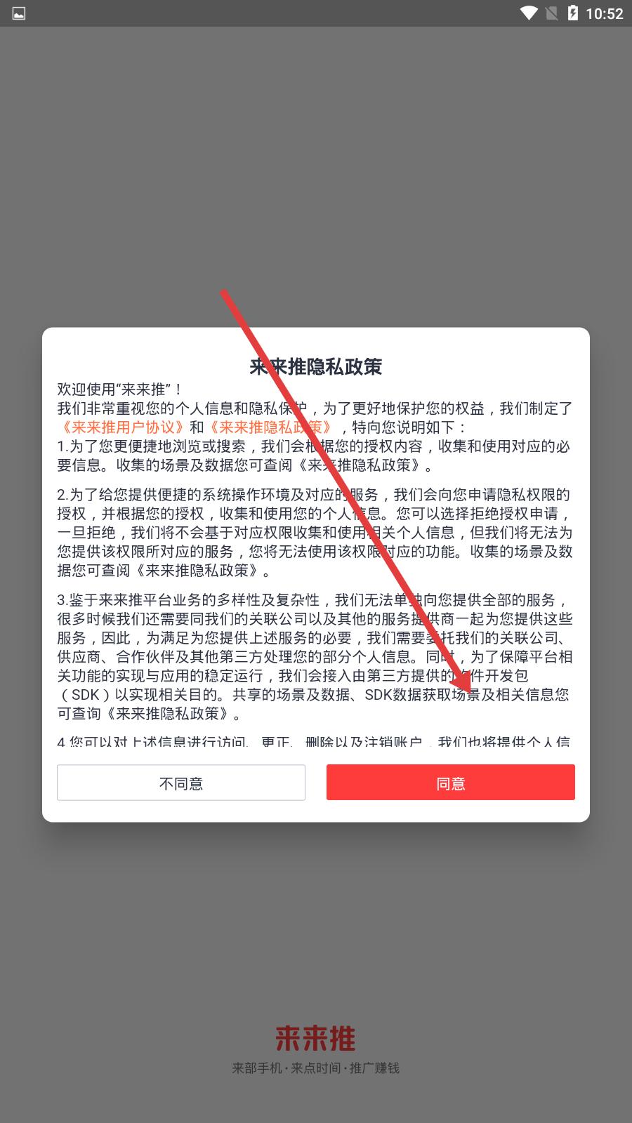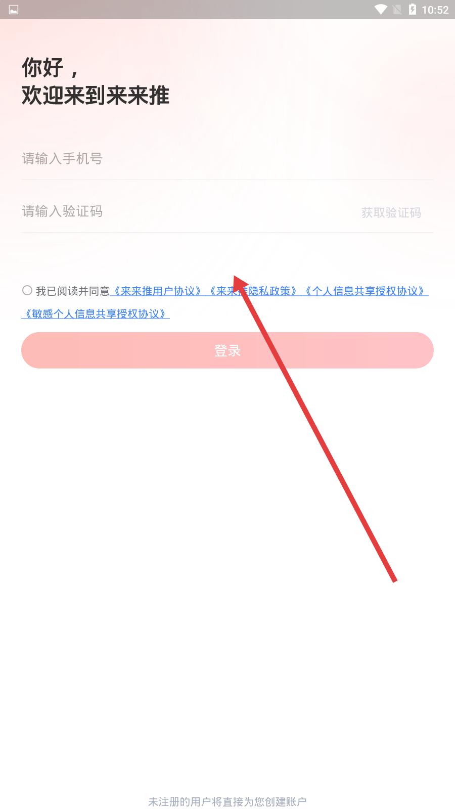 2、進入來來推的登錄頁面,需輸入手機號并獲取驗證碼,勾選閱讀并同意相關協議后,點擊登錄按鈕完成登錄。