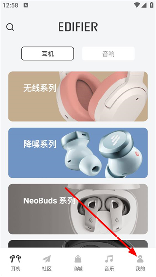 1、進入漫步者應用界面,頂部有搜索欄與EDIFIER標識,分耳機音響分類展示產品系列,底部設多選項,點擊我的進入對應頁面。