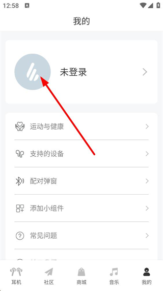 2、進入我的頁面,呈現未登錄狀態,含運動與健康等功能選項,可點擊未登錄區域,進入登錄相關操作界面。