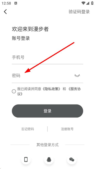 4、切換至賬號登錄頁面,需填寫手機號與密碼,勾選協議后完成登錄,也可選擇忘記密碼注冊賬號或其他登錄方式。