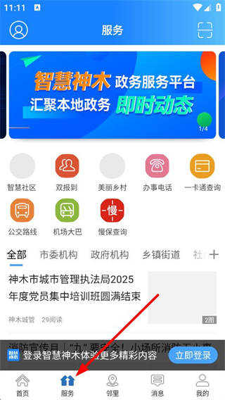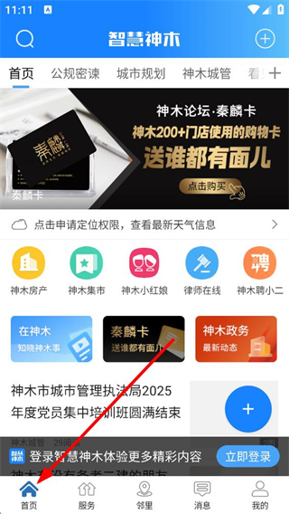 1、進入首頁可看到公規密諫、城市規劃等分類標簽,還有神木房產、神木集市等功能入口,下方呈現本地資訊,能便捷獲取神木本地信息。