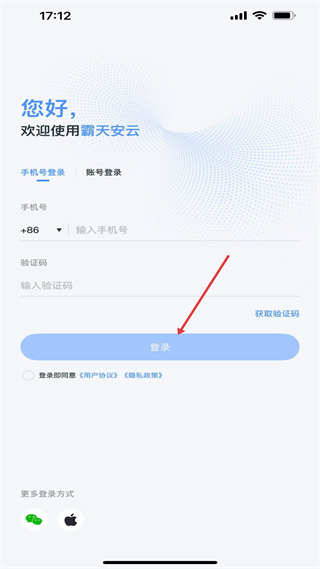 1、打開霸天安云應用,彈出溫馨提示彈窗,仔細閱讀隱私政策與用戶協議內容,點擊同意,進入登錄頁面。