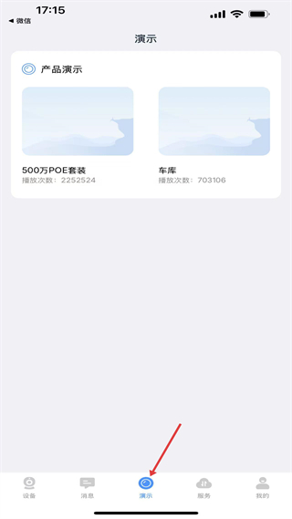 2、演示頁,有500萬POE套裝、車庫等產品演示,可查看播放次數,了解設備功能演示。