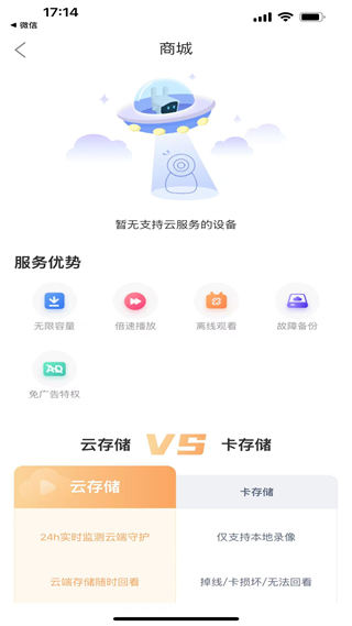 3、商城頁,展示云服務優勢,對比云存儲和卡存儲,云存儲有24h實時監測、隨時回看等優點,還介紹無限容量等服務優勢。