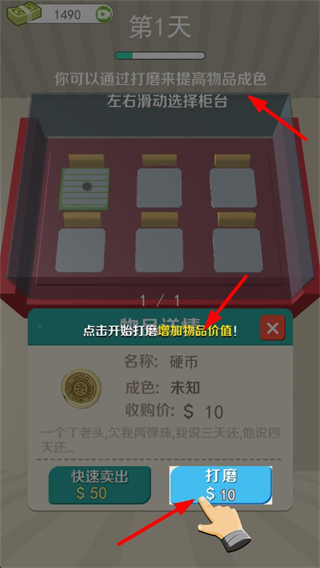 3、收購物品后可通過打磨提升其價值,左右滑動選擇柜臺,點擊打磨按鈕消耗對應金額,即可開始打磨物品。
