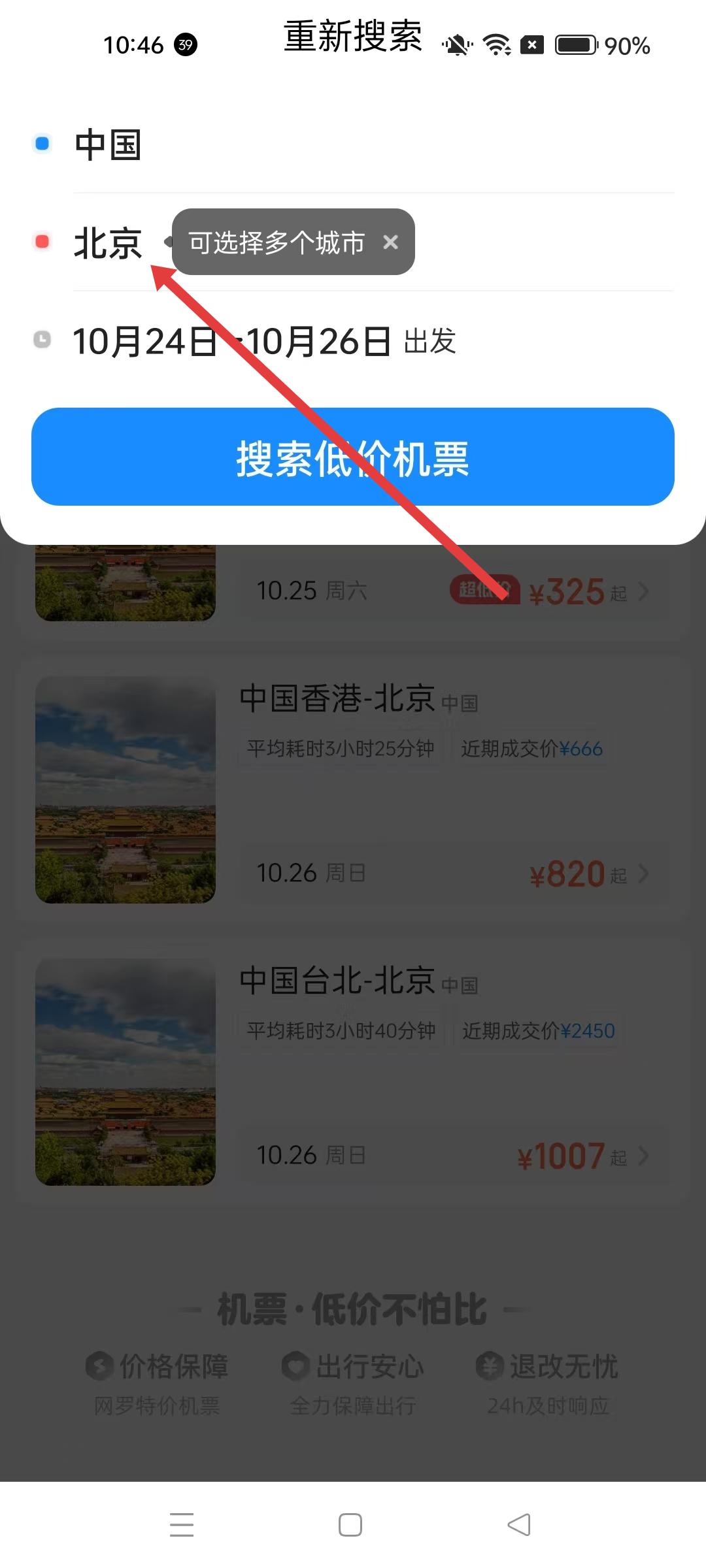 4、目的地選擇完成后,即可繼續進行機票查詢和預訂操作,以便規劃從中國到北京的行程。