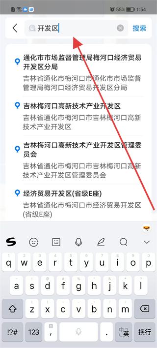 2、在搜索框輸入開發區,瀏覽搜索結果里的相關地址條目,選擇對應的區域選項,查看該地址對應的地理信息。