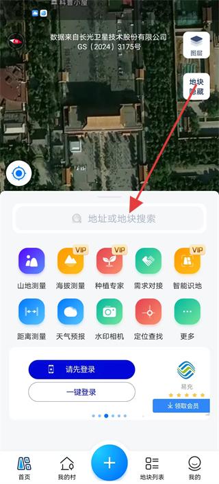 1、打開軟件進入首頁,點擊地址或地塊搜索框,輸入目標地址關鍵詞,準備查找對應的地理信息,使用山地測量等功能輔助查詢。