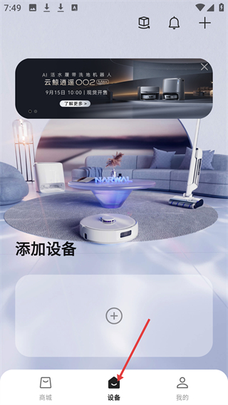 1、設備界面,展示添加設備入口,有云鯨逍遙002Max洗地機器人推廣,用戶可添加智能清潔設備開啟智能清潔體驗。