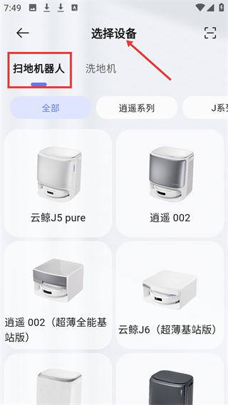 2、選擇設備界面,有掃地機器人和洗地機分類,展示多款掃地機器人型號,方便用戶按需選擇對應設備。