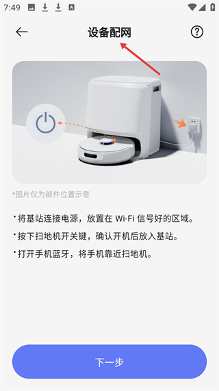 3、設備配網界面,指導用戶配網,需連接基站電源、放置在WiFi好的區域,按下掃地機開關放入基站,打開藍牙靠近設備。