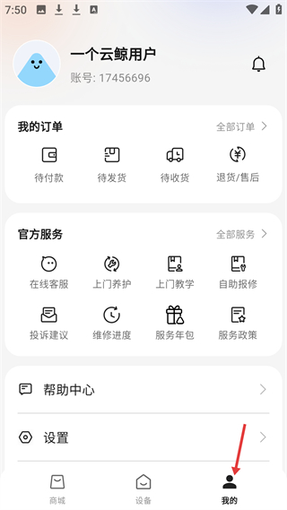 4、個人中心界面,顯示用戶賬號信息,有我的訂單、官方服務等板塊,可進行訂單管理、聯系客服、申請上門養護等操作。