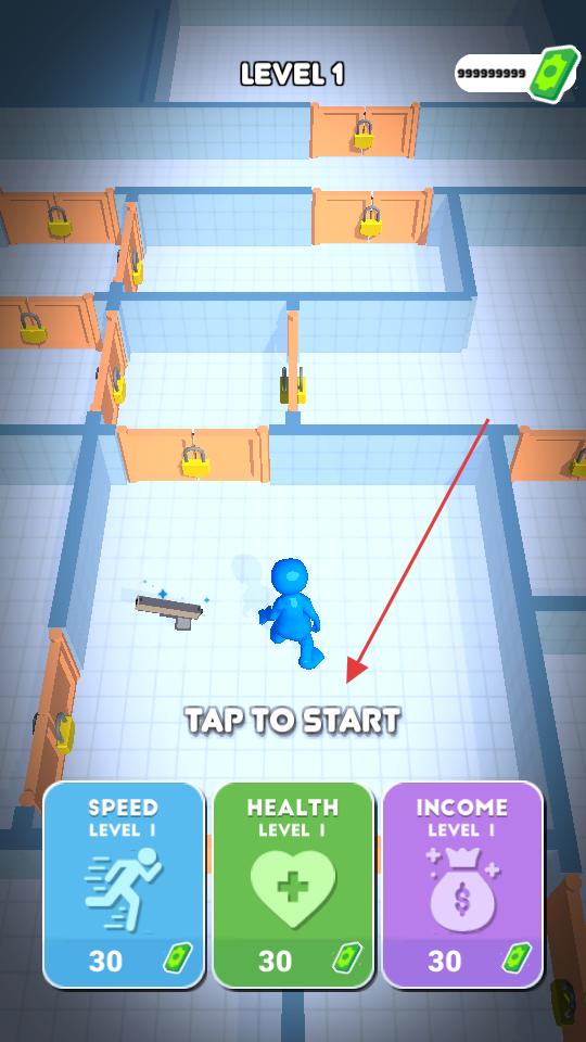 1、進入Level1界面點擊TAPTOSTART,操控藍色角色在布滿鎖門的場景里開始行動,同時可借助下方速度、生命、收益等屬性提升角色能力,為對抗紅色角色做好準備。