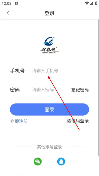 1、進入琴島通登錄頁,在手機號欄輸入對應號碼,在密碼欄填寫密碼,確認信息后點擊登錄按鈕,也可選擇驗證碼登錄等方式完成賬號登錄。